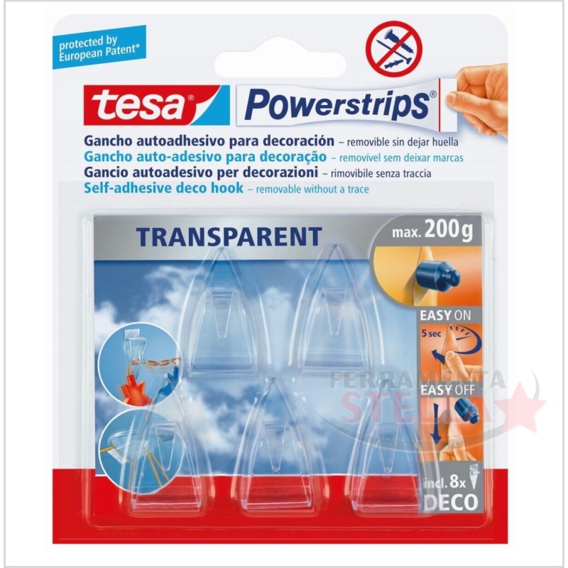 GANCI ADESIVI TESA POWERSTRIPS 58900. TRASPARENTE ALTERNATIVA A TRAPANO E CHIODI. FISSAGGI TENACI E RIMOZIONE SENZA LASCIARE TRACCIA, MAX 200G 5 GANCI+8 STRISCE BIADES.REMOV