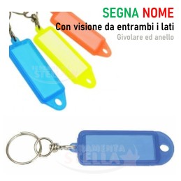 con anello - MM 56 X 22 - Portachiavi in plastica con targhetta segnanome, givolare e anello incluso. Colori assortiti. Promo disponibile per acquisti da 100 o 200 pezzi.