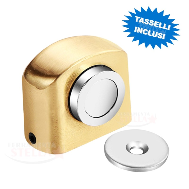 finitura DORATA - Fermaporta magnetico in zama con finitura ottonata, installazione a vite, ideale per porte interne e ambienti eleganti.