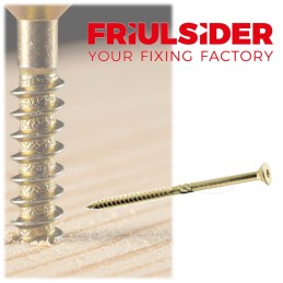 A testa piana svasata, impronta TORX, parzialmente filettata e finitura zincata gialla. Con frese sottotesta, che in avvitamento creano la sede per la testa senza provocare tensioni. Fresa a fine filettatura, per evitare la formazione dell'effetto cono, creando la sede per il gambo. Filettatura a passo largo, per ridurre i tempi di inserimento. Ideale per fissaggi portanti su legno in completa sicurezza.