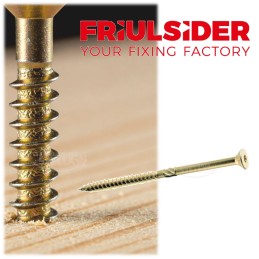 A testa piana svasata, impronta TORX, parzialmente filettata e finitura zincata gialla. Con frese sottotesta, che in avvitamento creano la sede per la testa senza provocare tensioni. Fresa a fine filettatura, per evitare la formazione dell'effetto cono, creando la sede per il gambo. Filettatura a passo largo, per ridurre i tempi di inserimento. Ideale per fissaggi portanti su legno in completa sicurezza.