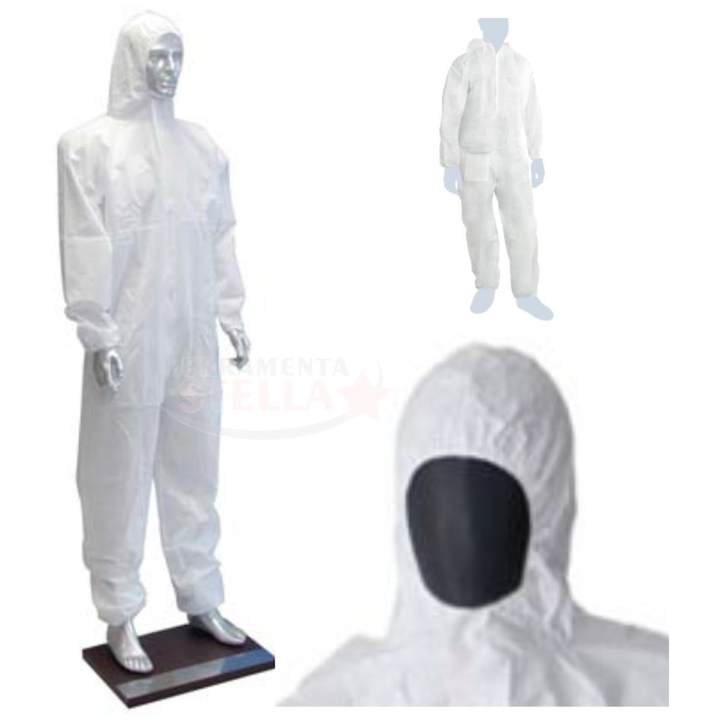 Tuta intera con cappuccio, traspirante, chiusura con cerniera, elastico sulle caviglie e ai polsi. In PLP bianco da Gr/Mq. 40.