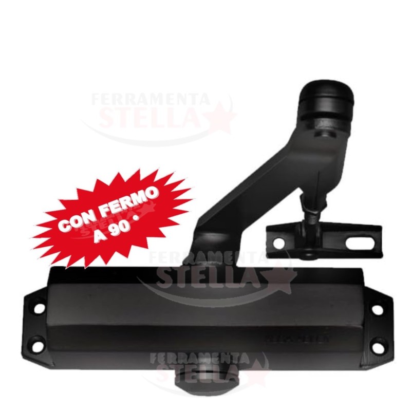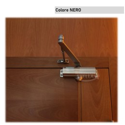 COLORE NERO - FORZA DA 2 A 4 REGOLABILE - Chiudiporta idraulico ambidestro con braccio, finitura nera, regolazione forza 2-4 e fermo di apertura integrato: ideale per porte antincendio e uso frequente.