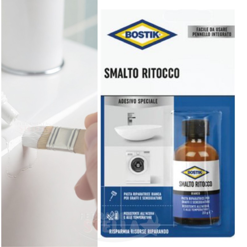 Bostik Smalto e ritocco per sanitari da bagno colore bianco anche per elettrodomestici con effetto riempitivo da gr 23 - Composto liquido bianco con applicatore a pennello specifico per riparare graffi, scheggiature e danni su vasche da bagno, lavelli, ecc. Resistente in acqua calda, ai detergenti comuni per uso domestico e alle basi diluite.