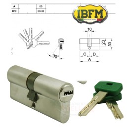 Cilindro sagomato IBFM 2304 in ottone nichelato satinato, lunghezza totale 60 mm (30+30), completo di 5 chiavi punzonate e viti di fissaggio. Sicurezza e qualità.