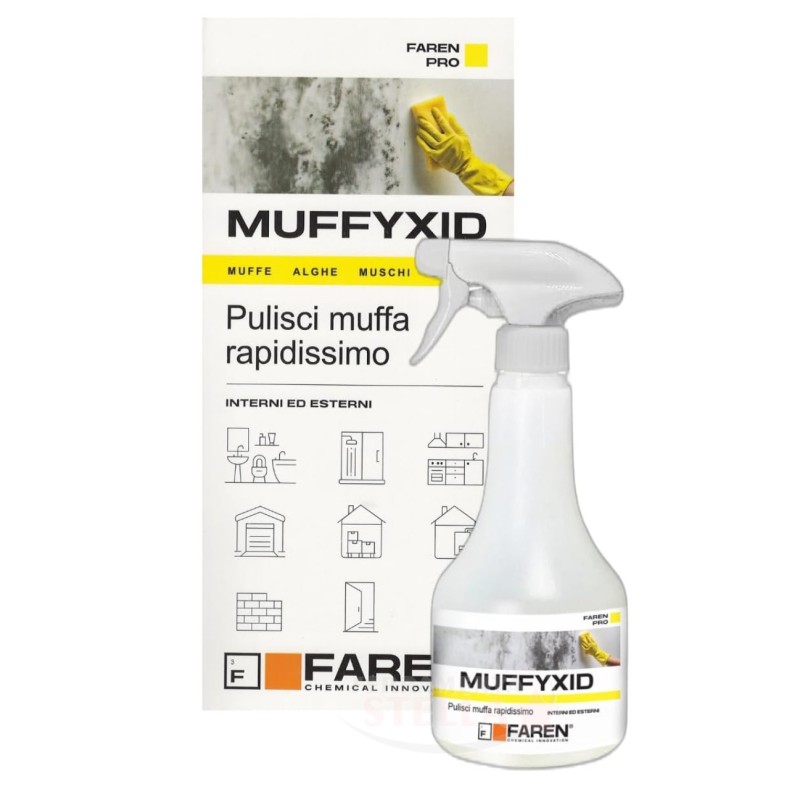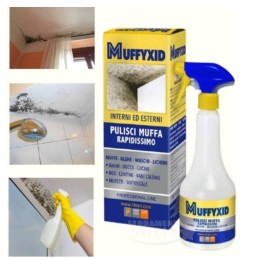 Muffyxid è un sciogli muffa pronto all’uso ad azione rapida ed efficace, ideale per il trattamento di muffe, muschi, alghe e licheni su pareti e rivestimenti murali. Grazie alla sua formula specifica, rimuove le contaminazioni biologiche e contemporaneamente sanifica e igienizza la superficie trattata. Si presenta in un pratico flacone spray da 500 ml, facile da utilizzare anche su zone difficili da raggiungere.