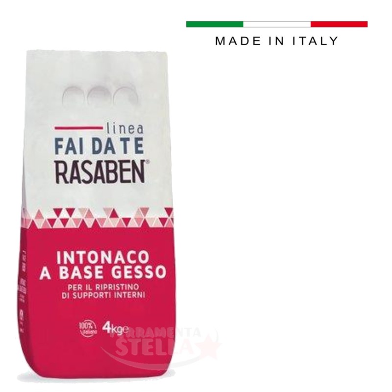 Rasaben in polvere intonaco pronto con gesso - kg. 4 - tipo premiscelato per interni Ideale per lavori di muratura su superfici interne. L’intonaco a base gesso viene impiegato come prodotto di lisciatura su intonaci di fondo per interno