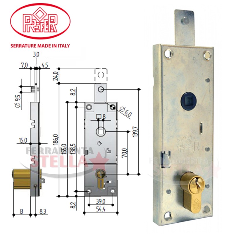 Serratura prefer b561 per porta basculante garage box auto cilindro sagomato - B : 16 MM - Serratura Prefer B561 per porte basculanti, con catenaccio a 1 mandata e cilindro in ottone sagomato.