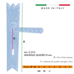 Si installa fissando le due maniglie sui lati opposti della porta tramite le viti di montaggio e il quadro maniglia, rispettando l'interasse da 90 mm e la corrispondenza con il foro chiave. L'inserzione è riferita alla coppia di maniglie ovvero adatte per una porta completa di quadro di collegamento accorciabile ad esigenza per porte non molto spesse.