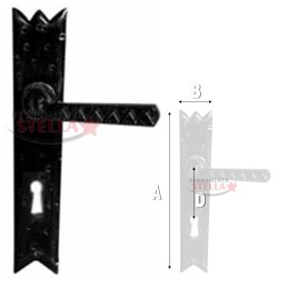 Maniglia in ferro battuto lavorato, per ambienti rustici. Maniglia in ferro battuto dallo stile rustico, ideale per porte interne in ambienti country o di montagna, con placca decorata e foro chiave.