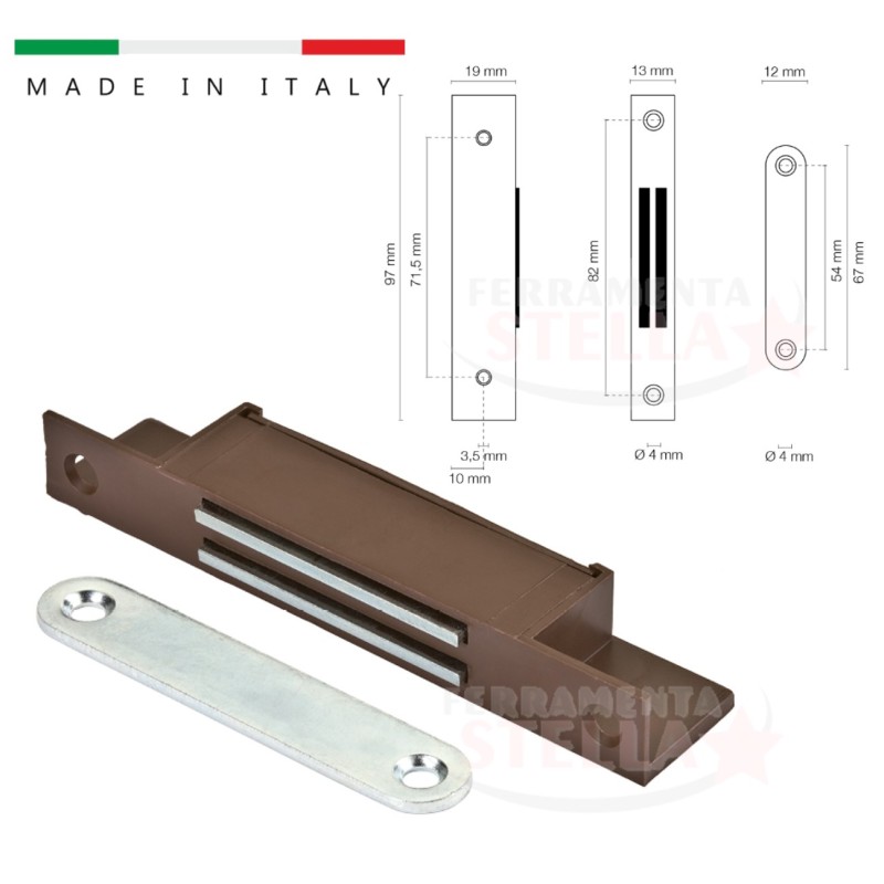 Magnetico da incasso o da applicare, per sportelli pesanti. Chiusure magnetiche marroni da incasso o da applicare forza 12 kg.