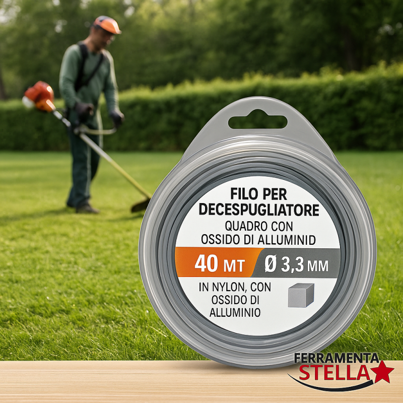 40 MT - Ø 3,3 MM Filo da 40 metri per decespugliatore con sezione quadrata e rinforzo in ossido di alluminio, adatto per tagliaerba e tosaerba.
