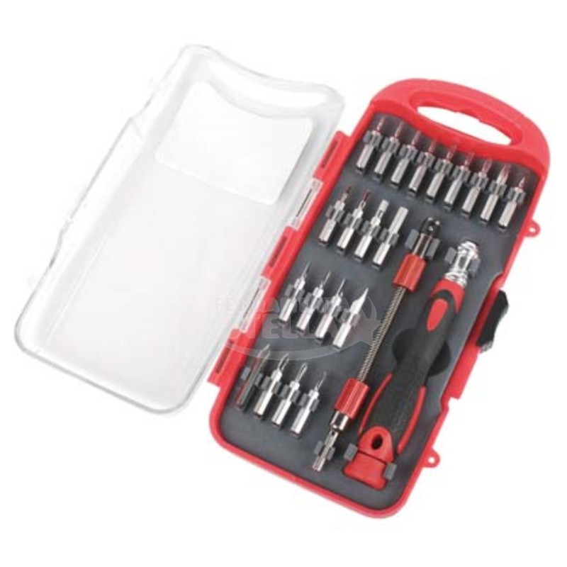 Set composto da 23 pezzi. 1 impugnatura e 1 adattatore flessibile. 21 inserti di precisione da 5/32"x1-1/8": PH 000, 00, 0 e 1; T 5, 6, 7, 8, 9, 10, 15 e 20; taglio Mm. 1,5, 2, 2,5, 3 e 4; esagonali Mm. 1,5, 2, 2,5, 3, 4.