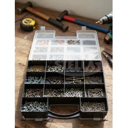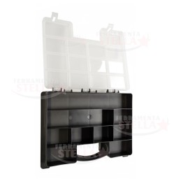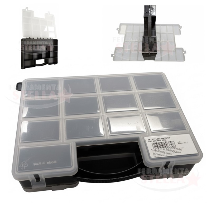 cm. 29x23x7 h Organizer per minuterie e attrezzi in plastica con maniglia. Misure 29x23x7 cm. Doppia apertura con circa 20 scomparti regolabili. Ideale per ferramenta, hobbistica e fai da te